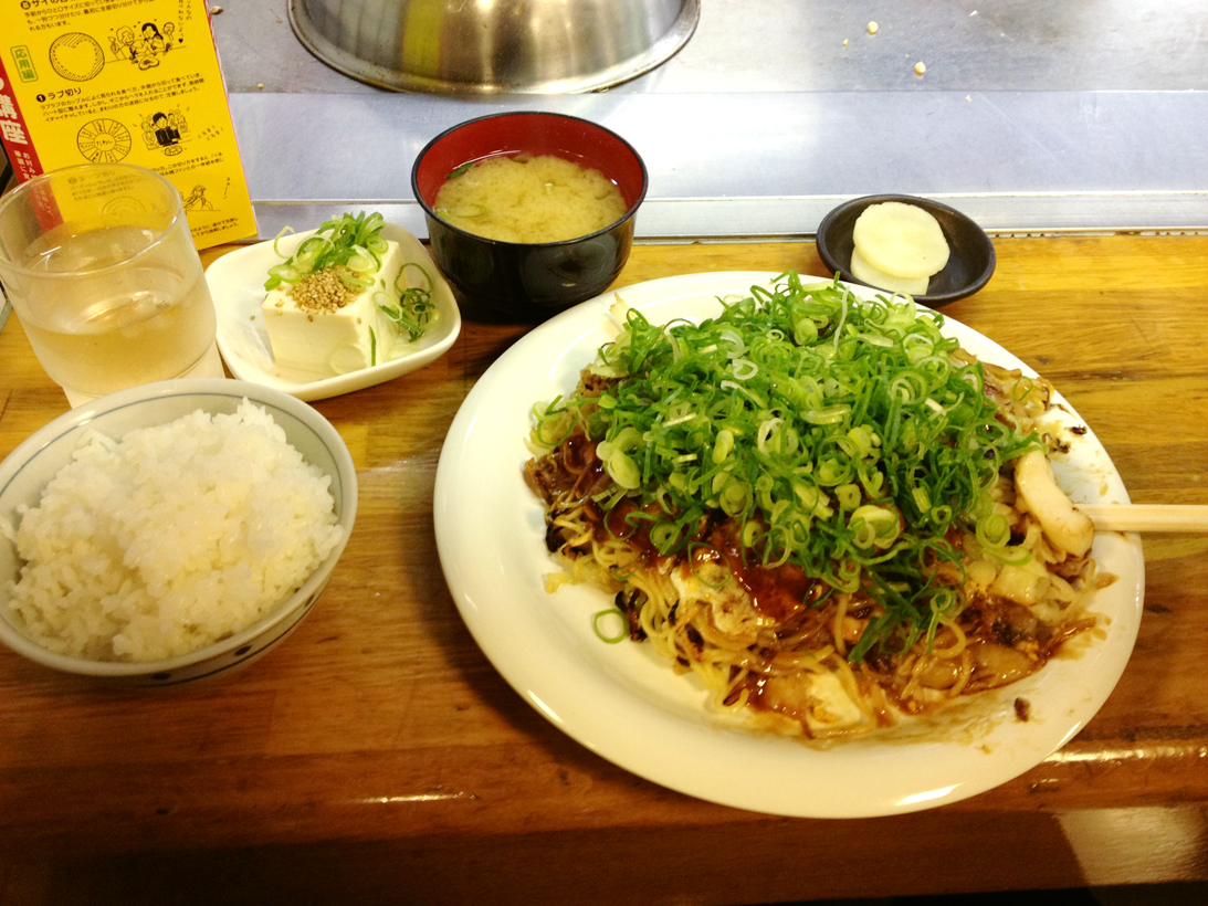 広島のお好み焼きは大阪とは違い、薄いクレープ記事の上にキャベツ、ヤキソバ、卵を順に