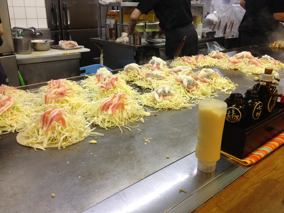 広島のお好み焼きは大阪とは違い、薄いクレープ記事の上にキャベツ、ヤキソバ、卵を順に